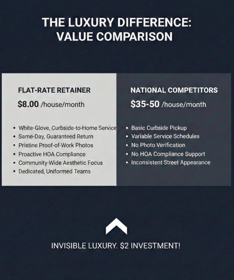 For $2 per house, per week, we transform your community's morning-after aesthetic. No more bins on the curb. No more neighborhood clutter!